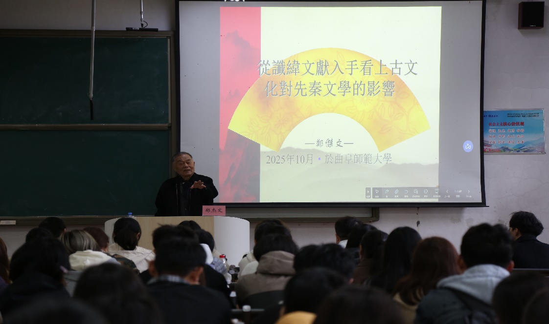 10月19日,我院邀请山东大学讲席教授、全球汉籍合璧工程原首席专家郑杰文先生为我院师生作题为《从谶纬文献入手看上古文化对先秦文学的影响》的学术报告。文学院部分教师和百余名本硕博学生参加报告会,本次报告会由文学院刘相雨教授主持。